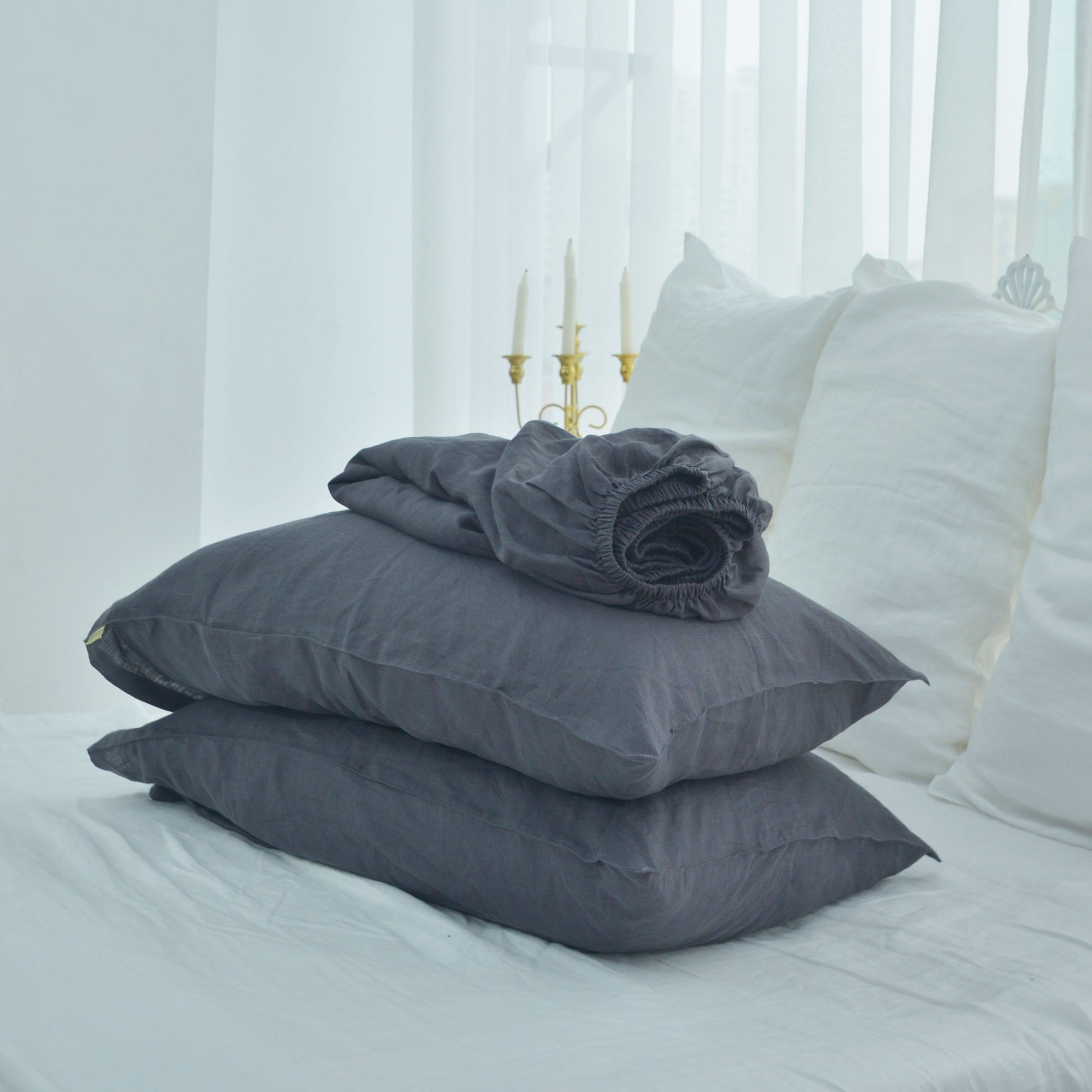 Dark French Linen Fitted Sheet + 2 Pillowcases Set - Plain Dyeing 08