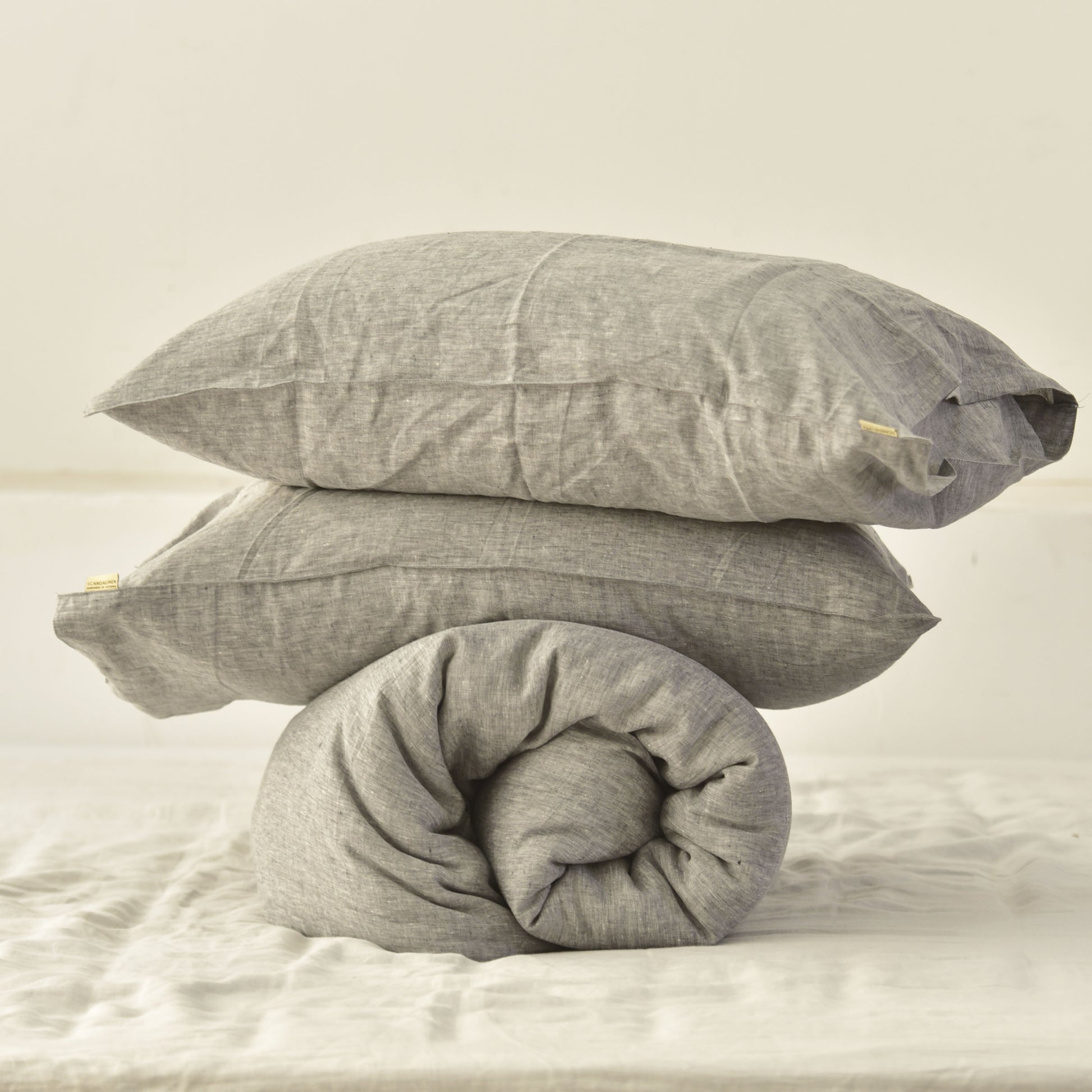 Gray French Linen Duvet Cover+2 Pillowcases Set - Yarn Dyeing 40
