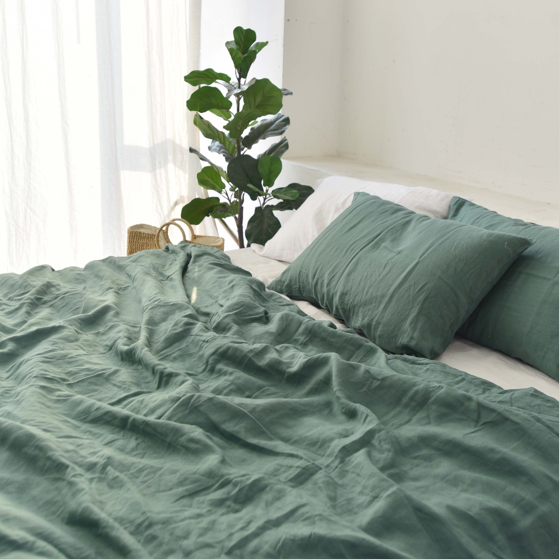 Green French Linen Fitted Sheet + 2 Pillowcases Set - Plain Dyeing 25